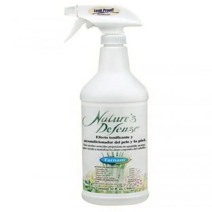 Se trata de una alternativa libre de químicos 100% natural y enriquecida con menta, tomillo, aceites esenciales y clavo. Lo encuentras en envase pulverizador de 946 ml.El producto no contiene alcohol por lo tanto no irrita la piel y utiliza una base acuosa no aceitosa de efectos tonificantes y acondicionadores. Sin duda es la mejor alternativa para el cuidado del pelo y piel de tu caballo. VetNova Nature's Defense, un acondicionador respetuoso del medio ambiente, de fragancia agradable y libre de sustancias dopantes. VENTAJAS:100% natural.Posee una fragancia agradable.No contiene alcohol y no irrita la piel.USOS Y ESPECIFICACIONES:Acondicionador y tonificante rico en menta, tomillo, aceites esenciales y clavo para la piel y pelaje de caballos.