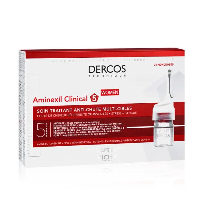 Dercos Aminexil Clinical 5 Mujer es un tratamiento anti caída de uso tópico con el que se observa una reducción de la caída en 6 semanas y un pelo más grueso y resistente a partir de la tercera semana.