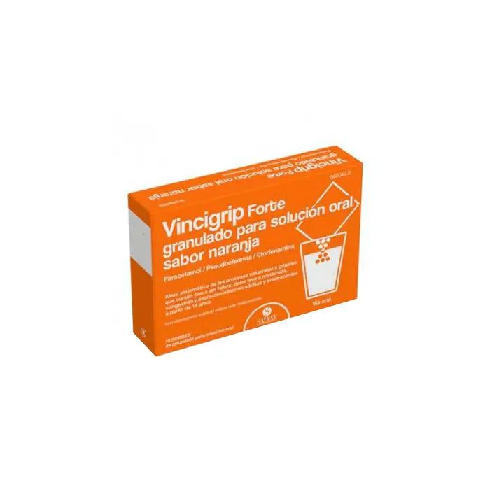 Los principios activos de Vincigrip Forte sabor Naranja son: paracetamol, pseudoefedrina hidrocloruro y clorfenamina maleato. Cada sobre contiene 650 mg de paracetamol, 30 mg de pseudoefedrina hidrocloruro y 4 mg de clorfenamina maleato.