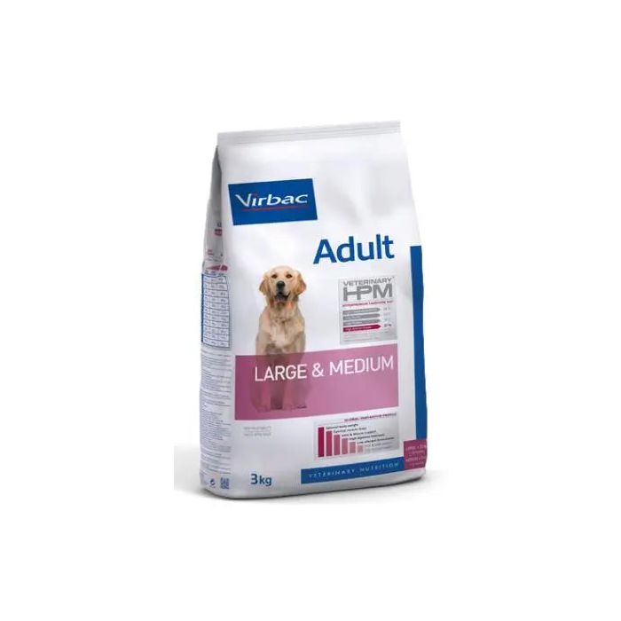 Veterinary HPM Adult Dog Large & Medium es una dieta completa para perros de razas medianas (10-25 kg) a partir de los 12 meses, y para perros de razas grandes (>25kg) a partir de los 18 meses de edad.VETERINARY HPM™ es una nueva generación de alimentos para perros diseñada para acercarse al máximo a las necesidades nutricionales de los carnívoros. Se basa en una fórmula baja en hidratos de carbono y rica en proteínas animales. El resultado es una nutrición que se adapta perfectamente a las necesidades de tu perro.El pienso Adult Dog Large & Medium de Virbac cuenta con un 34% de proteína de la cual el 87% es de origen animal.En perros adultos, el desafio consiste en mantener un peso y una composición corporal óptima a través de una dieta equilibrada y nivles apropiados de actividad.BeneficiosControl del peso corporal El balance adecuado entre proteína, grasa e hidratos de carbono ayuda a mantener una condición corporal óptima.Masa muscular óptima. El contenido elevado de proteína favorece el mantenimiento de la masa muscular.Refuerzo articular y muscular. Gracias al nivel elevado de proteínas y los suplementos de condroitín y quitosán, se favorece un sistema músculo esquelético fuerte y saludable.Tolerancia digestiva. El bajo contenido de almidón ayuda a asegurar que el alimento sea bien tolerado por el sistema digestivo del animal. La elección de prebióticos y probióticos regulan el tránsito intestinal y contribuyen a una flora intestinal equilibrada.Refuerzo para la piel y el pelo. Los niveles elevados de proteína animal y el correcto equilibrio entre ácidos grasos esenciales omega-3 y omega-6 contribuyen a mejorar la función de la piel, favoreciendo un pelo saludable y brillante.VETERINARY HPM™Gracias a su perfil nutricional y a la selección precisa de ingredientes funcionales, VETERINARY HPM™ es algo más que un simple alimento para perros. Contiene una amplia variedad de beneficios para la salud, permitiendo que tu perro disfrute de una mejor protección de su estado fisiológico y conserve una buena salud general.Especificaciones del productoComposición:Proteínas de cerdo y de aves deshidratadas, arroz (mínimo 4%), grasas animales, guisante, proteínas de cerdo y de aves hidrolizadas, almidón de patata (mínimo 4%), lignocelulosa, vainas de haba, linaza,minerales, pulpa de remolacha, fibra de psyllium (Plantago (L.) spp.), fructooligosacáridos, levadura de cerveza, crustáceos hidrolizados (fuente de quitosán), Lactobacillus acidophilus, condroitín sulfato.Veterinary HPM™ no contiene saborizantes ni colorantes artificialesConstituyentes analíticos:(% como alimento): Humedad 9%, proteína 34%, ratio proteína animal/vegetal 87/13, materia grasa bruta 17%, minerales 7,5%, celulosa bruta 5%, ELN*: 27,5%, almidón: 21%, calcio: 1,3%, fósforo: 1,1%, ratio Ca/P: 1,2%, sodio: 0,5%, ácidos grasos omega-6: 2,2%, ácidos grasos Omega-3: 0,8%EM** calculada (kcal/100g)*** 370 * Extracto libre de nitrógeno. ** Energía metabolizable. *** Calculada con NRC 2006.