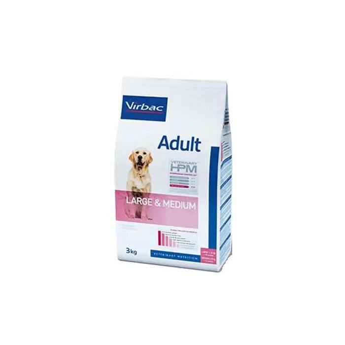 Veterinary HPM Adult Dog Large & Medium es una dieta completa para perros de razas medianas (10-25 kg) a partir de los 12 meses, y para perros de razas grandes (>25kg) a partir de los 18 meses de edad.VETERINARY HPM™ es una nueva generación de alimentos para perros diseñada para acercarse al máximo a las necesidades nutricionales de los carnívoros. Se basa en una fórmula baja en hidratos de carbono y rica en proteínas animales. El resultado es una nutrición que se adapta perfectamente a las necesidades de tu perro.El pienso Adult Dog Large & Medium de Virbac cuenta con un 34% de proteína de la cual el 87% es de origen animal.En perros adultos, el desafio consiste en mantener un peso y una composición corporal óptima a través de una dieta equilibrada y nivles apropiados de actividad.BeneficiosControl del peso corporal El balance adecuado entre proteína, grasa e hidratos de carbono ayuda a mantener una condición corporal óptima.Masa muscular óptima. El contenido elevado de proteína favorece el mantenimiento de la masa muscular.Refuerzo articular y muscular. Gracias al nivel elevado de proteínas y los suplementos de condroitín y quitosán, se favorece un sistema músculo esquelético fuerte y saludable.Tolerancia digestiva. El bajo contenido de almidón ayuda a asegurar que el alimento sea bien tolerado por el sistema digestivo del animal. La elección de prebióticos y probióticos regulan el tránsito intestinal y contribuyen a una flora intestinal equilibrada.Refuerzo para la piel y el pelo. Los niveles elevados de proteína animal y el correcto equilibrio entre ácidos grasos esenciales omega-3 y omega-6 contribuyen a mejorar la función de la piel, favoreciendo un pelo saludable y brillante.VETERINARY HPM™Gracias a su perfil nutricional y a la selección precisa de ingredientes funcionales, VETERINARY HPM™ es algo más que un simple alimento para perros. Contiene una amplia variedad de beneficios para la salud, permitiendo que tu perro disfrute de una mejor protección de su estado fisiológico y conserve una buena salud general.Especificaciones del productoComposición:Proteínas de cerdo y de aves deshidratadas, arroz (mínimo 4%), grasas animales, guisante, proteínas de cerdo y de aves hidrolizadas, almidón de patata (mínimo 4%), lignocelulosa, vainas de haba, linaza,minerales, pulpa de remolacha, fibra de psyllium (Plantago (L.) spp.), fructooligosacáridos, levadura de cerveza, crustáceos hidrolizados (fuente de quitosán), Lactobacillus acidophilus, condroitín sulfato.Veterinary HPM™ no contiene saborizantes ni colorantes artificialesConstituyentes analíticos:(% como alimento): Humedad 9%, proteína 34%, ratio proteína animal/vegetal 87/13, materia grasa bruta 17%, minerales 7,5%, celulosa bruta 5%, ELN*: 27,5%, almidón: 21%, calcio: 1,3%, fósforo: 1,1%, ratio Ca/P: 1,2%, sodio: 0,5%, ácidos grasos omega-6: 2,2%, ácidos grasos Omega-3: 0,8%EM** calculada (kcal/100g)*** 370 * Extracto libre de nitrógeno. ** Energía metabolizable. *** Calculada con NRC 2006.