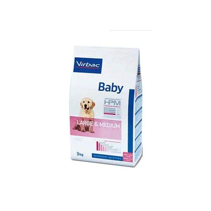 Veterinary HPM Baby Dog Large & Medium es una dieta completa para cachorros de razas grandes (peso adulto > 25 kg) hasta los 7 meses de edad, y razas medianas (peso adulto 11-25 kg) hasta los 6 meses de edad. Además, es una dieta indicada para perras de razas grandes y medianas en gestación o que estén amamantando a sus cachorros.VETERINARY HPM™ es una nueva generación de alimentos para perros diseñada para acercarse al máximo a las necesidades nutricionales de los carnívoros. Se basa en una fórmula baja en hidratos de carbono y rica en proteínas animales. El resultado es una nutrición que se adapta perfectamente a las necesidades de tu perro.El pienso Baby Dog Large & Medium de Virbac cuenta con un 35% de proteínas de las cuales el 89% son de origen animal.Durante sus primeros meses de vida, los cachorros de razas grandes y medianas tienen unos requisitos intensos en cuanto a energía, proteínas y minerales, para asegurar un crecimiento saludable del esqueleto. Además su sistema digestivo es delicado y su sistema inmunitario es inmaduro, por lo que necesitan un alimento adaptado a ello, y que asegure un crecimiento saludable.BeneficiosInicio del crecimiento. La elevada energía y fácil digestión del alimento consiguen una dieta que cubre los requisitos para un crecimiento intenso y rápido al principio de la vida del animal.Aporte calórico elevado. Con su contenido elevado de grasas, la energía de esta dieta es elevada, lo que satisface los requisitos intensos para el crecimiento.Refuerzo articular y óseo. El elevado contenido de proteínas y los niveles equilibrados de calcio y fósforo contribuyen a un crecimiento saludable del esqueleto.Refuerzo inmunitario. El suplemento de betaglucano favorece en los cachorros la adquisición de sus propias defensas, mejora la respuesta a las vacunas e incrementa el nivel de resistencia a las enfermedades.Tolerancia digestiva. El bajo contenido de almidón ayuda a asegurar que el alimento sea bien tolerado por el sistema digestivo del animal. La elección de prebióticos y probióticos regulan el tránsito intestinal y contribuyen a una flora intestinal equilibrada. VETERINARY HPM™Gracias a su perfil nutricional y a la selección precisa de ingredientes funcionales, VETERINARY HPM™ es algo más que un simple alimento para perros. Contiene una amplia variedad de beneficios para la salud, permitiendo que tu perro disfrute de una mejor protección de su estado fisiológico y conserve una buena salud general.