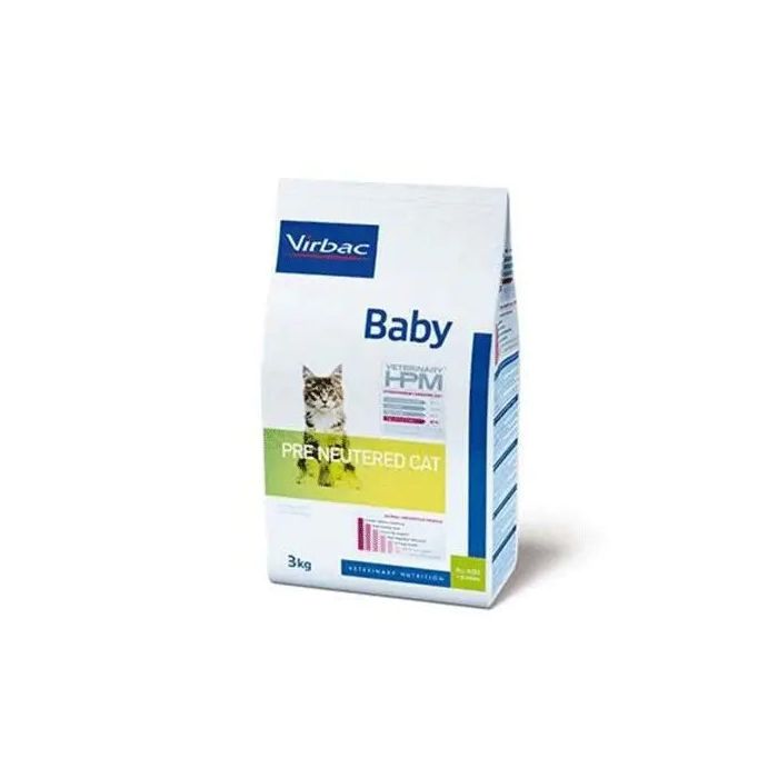Veterinary HPM Baby pre neutered Cat es una alimentación adecuada para gatitos, desde el destete y hasta los 12 meses de edad, o antes de la esterilización. Además, está indicada para gatas gestantes o que estén amamantando a sus gatitos.VETERINARY HPM es una nueva generación de alimentos para gatos diseñada para acercarse al máximo a las necesidades nutricionales de los carnívoros. Se basa en una fórmula baja en hidratos de carbono y rica en proteínas. El resultado es una nutrición que se adapta perfectamente a las necesidades de tu gato.El pienso Baby Pre Neutered Cat de Virbac cuenta con un 45% de proteína, de la cual el 92% es de origen animal.Los gatitos tienen unos requisitos estrictos para un crecimiento saludable, particularmente en términos de energía, proteínas y minerales. Tienen el sistema digestivo delicado y el sistema necesario para generar defensas contra enfermedades es todavía inmaduro, por ello la alimentación Veterinary HPM Baby Pre Neutered Cat cuenta con todos los requerimientos nutricionales necesarios para la correcta salud de los gatitos y gatas gestantes y lactantes.BeneficiosCrecimiento antes de la esterilización. Los gatitos tienen un crecimiento intenso y rápido, así pues la elevada concentración de energía y gran digestibilidad del alimento, su alto aporte en proteínas y niveles equilibrados de minerales, aseguran su crecimiento óptimo y saludable.Aporte calórico elevado. Un contenido elevado de grasas ayuda a conseguir toda esa energía indispensable para crecer durante la etapa de gatito.Refuerzo inmunitario. El suplemento de betaglucano favorece en los gatitos la adquisición de sus propias defensas, mejora la respuesta a las vacunas e incrementa el nivel de resistencia a las enfermedades.Tolerancia digestiva. El bajo contenido de almidón favorece la tolerancia del alimento durante la digestión del gatito. Una cuidada selección de prebióticos y probióticos regulan el tránsito intestinal y contribuyen a mantener una salud intestinal óptima.Salud urinaria. El nivel elevado de proteínas animales ayuda a estabilizar el pH urinario. Especificaciones del productoComposición:Proteínas de cerdo y de aves deshidratadas, grasas animales, almidón de patata (mínimo 4%), proteínas de cerdo y de aves hidrolizadas, guisantes,arroz (mínimo 4%), minerales, vainas de haba, pulpa de remolacha, lignocelulosa, levadura de cerveza (fuente de betaglucanos), linaza, aceite de pescado, fibra de psyllium (Plantago (L.) spp.), fructooligosacáridos, crustáceos hidrolizados (fuente de quitosán), condroitín sulfato, Lactobacillus acidophilus.Veterinary HPM™ no contiene saborizantes ni colorantes artificialesConstituyentes analíticos:(% como alimento): Humedad 5,5%, proteína 45%, ratio proteína animal/vegetal 92/08, materia grasa bruta 20%, minerales 8,5%, celulosa bruta 4%, ELN*: 17%, almidón: 13,5%, calcio: 1,3%, fósforo: 1,1%, ratio Ca/P: 1,2, sodio: 0,7%, ácidos grasos omega-6: 3,3%, ácidos grasos Omega-3: 1%EM** calculada (kcal/100g)*** 412 * Extracto libre de nitrógeno. ** Energía metabolizable. *** Calculada con NRC 2006.VETERINARY HPM™Gracias a su perfil nutricional y a la selección precisa de ingredientes funcionales, VETERINARY HPM™ es algo más que un simple alimento para gatos. Contiene una amplia variedad de beneficios para la salud, permitiendo que tu gato disfrute de una mejor protección de su estado fisiológico y conserve una buena salud general.