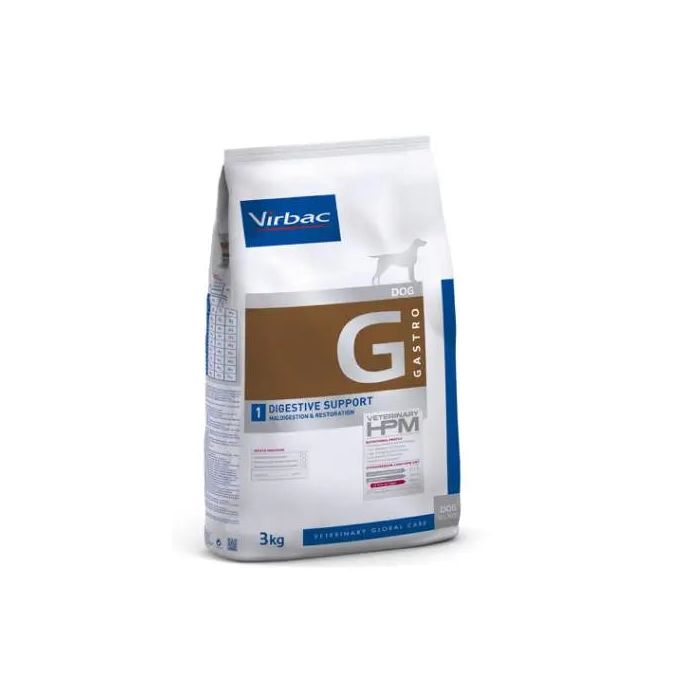 Veterinary HPM G1 Digestive Support es una alimentación dietética, indicada para trastornos gastrointestinales como compensación de las alteraciones de la digestión, reducción de los trastornos agudos de la absorción intestinal, e insuficiencia pancreática exocrina crónica. Además, está indicada para recuperación nutricional y convalecencia.El pienso G1 Digestive Support de Virbac cuenta con una dieta baja en hidratos de carbono y rica en proteínas. Con un 34% de proteína, de la cual el 92% es de origen animal.La nutrición Veterinary HPM es de uso específico y debe ser prescrita por tu veterinario de confianza. BeneficiosPromueve la recuperación nutricional. Los niveles elevados de nutrientes esenciales y densidad de energía ayudan a compensar las pérdidas y permiten la recuperación de la composición corporal.Fórmula baja en alérgenos. La dieta está elaborada sin vacuno, gluten, maíz, trigo, soja, huevo y pescado. El número de fuentes de proteína está limitado a 3: cerdo, aves y arroz, para reducir al mínimo las posibles causas de alergia y las reacciones digestivas no deseadas.Elevada energía y concentración. La elevada cantidad de energía del alimento reduce el tamaño de la ración diaria y ayuda a reducir el trabajo del aparato digestivo. Gran parte de la energía proviene de la grasa y de la proteína, que el cuerpo utiliza fácilmente y resulta muy beneficioso para la recuperación de la mascota. Proporciona una concentración elevada de todos los nutrientes esenciales, que permite cubrir las elevadas necesidades en pequeñas raciones.Baja en almidón. El arroz es la única fuente de almidón, por lo que su bajo nivel de almidón facilita la digestibilidad del alimento y su tolerancia digestiva.Complejo Digest Plus. La adición de ingredientes específicos, como probióticos y prebióticos, ayuda a recuperar rápidamente la función digestiva, mejorar la tolerancia digestiva y producir unas heces normales. Otros usosGastritis / enteritis / colitis.Megacolon.Enfermedad inflamatoria intestinal.Recuperación tras cirugía digestiva.Recuperación tras enfermedad.Recuperación tras periodo de anorexia. VETERINARY HPM DietasPerros y gatos son carnívoros, estén sanos o enfermos. VETERINARY HPM TM Dietas de prescripción, se basa en una formulación rica en proteínas y baja en hidratos de carbono (RP-BC), con más de un 90% de proteínas de origen animal, nutrición adapta a las necesidades del animal.Especificaciones del productoComposición:Proteínas de cerdo y de aves deshidratadas,* arroz,* grasas animales,* lignocelulosa, proteínas de cerdo y de aves hidrolizadas,* pulpa de remolacha, minerales, aceite de pescado,* linaza, levadura de cerveza (fuente de betaglucanos y nucleótidos), fibra de psyllium (Plantago (L.) spp.), fructooligosacáridos, butirato de calcio, Lactobacillus acidophilus.Veterinary HPM™ no contiene saborizantes ni colorantes artificiales Constituyentes analíticos:(% como alimento): Humedad 9%, proteína 34%, ratio proteína animal/vegetal 92/08, materia grasa bruta 22%, minerales 7,5%, fibra bruta 6%, ELN*: 21,5%, almidón: 17%, calcio: 0,9%, fósforo: 0,9%, sodio: 0,6%, potasio: 0,8%, ácidos grasos omega-6: 2,5%, ácidos grasos omega-3: 0,9%, EPA + DHA: 0,3%. *Ingredientes muy digestiblesEM** calculada (kcal/100g)*** 384 * Extracto libre de nitrógeno. ** Energía metabolizable. *** Calculada con NRC 2006.