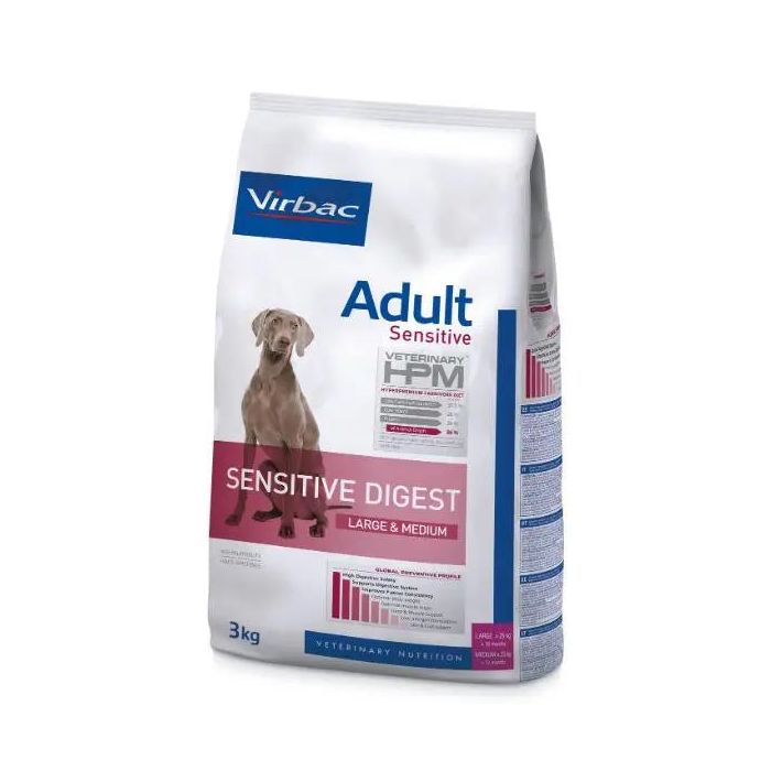 Veterinary HPM Adult Dog Sensitive Digest Large & Medium es una dieta completa para perros adultos de razas medianas y grandes con sensibilidad digestiva, a partir de los 18 meses para razas grandes (>25kg) o a partir de los 12 meses para razas medianas (11-25 kg)VETERINARY HPM™ es una nueva generación de alimentos para perros diseñada para acercarse al máximo a las necesidades nutricionales de los carnívoros. Se basa en una fórmula baja en hidratos de carbono y rica en proteínas animales. El resultado es una nutrición que se adapta perfectamente a las necesidades de tu perro.El pienso Adult Dog Sensitive Digest Large & Medium de Virbac cuenta con 29% de proteína de la cual el 88% es de origen animal.El 28% de los perros sanos de razas grandes y medianas sufre alguna sensibilidad digestiva, sobre todo los de algunas razas como Pastor alemán, Labrador retriever, Bulldog francés o Beagle. Esto es debido a su anatomía, ya que tienen un colon de mayor tamaño y un tiempo de tránsito intestinal superior al de los perros pequeños.Veterinary HPM™ ha incluido una formulación especial con un complejo digestible enriquecido para abordar las necesidades específicas de estos perros. BeneficiosRefuerzo del sistema digestivo. La rigurosa selección de ingredientes (sin guisantes, con arroz como fuente única de almidón, y proteína animal de alta calidad) mejora la digestibilidad del alimento.Mejora la consistencia de las heces. Ayuda a mejorar de forma significativa la consistencia de las heces en tan solo 7 días. Eficacia probada por Virbac.**Control del peso corporal. El aporte equilibrado de proteína, grasa e hidratos de carbono y unas raciones adaptadas, ayudan a mantener una condición corporal óptima.Masa muscular óptima. El contenido elevado de proteína ayuda a mantener la masa muscular saludable.VETERINARY HPM™Gracias a su perfil nutricional y a la selección precisa de ingredientes funcionales, VETERINARY HPM™ es algo más que un simple alimento para perros. Contiene una amplia variedad de beneficios para la salud, permitiendo que tu perro disfrute de una mejor protección de su estado fisiológico y conserve una buena salud general.Especificaciones del productoComposición:Proteínas de cerdo y de aves deshidratadas, arroz (mínimo 4%), grasas animales, lignocelulosa, proteínas de cerdo y de aves hidrolizadas,minerales, linaza, pulpa de remolacha, fibra de psyllium (Plantago (L.) spp.), fructooligosacáridos,levadura de cerveza, Yucca schidigera, crustáceos hidrolizados (fuente de quitosán), Lactobacillus acidophilus, condroitín sulfato.Veterinary HPM™ no contiene saborizantes ni colorantes artificialesConstituyentes analíticos:(% como alimento): Humedad 9%, proteína 29%, ratio proteína animal/vegetal 88/12, materia grasa bruta 14%, minerales 7,5%, celulosa bruta 7,5%, ELN*: 33%, almidón: 26%, calcio: 1,3%, fósforo: 1%, ratio Ca/P: 1,3%, sodio: 0,4%, ácidos grasos omega-6: 2,2%, ácidos grasos Omega-3: 0,7%EM** calculada (kcal/100g)*** 338 * Extracto libre de nitrógeno. ** Energía metabolizable. *** Calculada con NRC 2006.