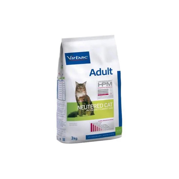 Veterinary HPM Adult Neutered Cat es una dieta completa para gatos adultos esterilizados, a partir del año de edad.VETERINARY HPM es una nueva generación de alimentos para gatos diseñada para acercarse al máximo a las necesidades nutricionales de los carnívoros. Se basa en una fórmula baja en hidratos de carbono y rica en proteínas. El resultado es una nutrición que se adapta perfectamente a las necesidades de tu gato.El pienso Adult Neutered Cat de Virbac cuenta con un 44% de proteína, de la cual el 90% es de origen animal.Los gatos adultos esterilizados están predispuestos a sufrir dos problemas importantes: exceso de peso y enfermedad del tracto urinario inferior, por lo que es fundamental adaptar su dieta a la prevención de estas patologías.BeneficiosControl del peso corporal. La baja concentración de energía de la dieta, y raciones diarias adaptadas, el aumento de fibra para conseguir mayor saciedad y el suplemento de L-carnitina que limita el aumento de grasa, colaboran en un mayor control del peso corporal.Salud urinaria. El nivel elevado de proteínas animales estimula la ingestión de agua, incrementa la cantidad de orina y ayuda a estabilizar el pH para un sistema urinario saludable. El suplemento de quitosán ayuda a regular la eliminación de fósforo por la orina y previene la formación de cristales de estruvita.Mantiene la función renal. Los niveles elevados de proteina contribuyen a un mayor consumo de agua que junto al contenido controlado de fósforo colaboran en mantener una función renal saludable.Control del sarro dental. Gracias a la incorporación de ingredientes especiales que ayudan a limitar la formación de placa dental y sarro, lo que asegura una buena salud oral.Refuerzo para la piel y el pelo. Los niveles elevados de proteína animal y el correcto equilibrio entre ácidos grasos esenciales omega-3 y omega-6 contribuyen a mejorar la función de la piel para favorecer un pelo saludable y brillante.VETERINARY HPM™Gracias a su perfil nutricional y a la selección precisa de ingredientes funcionales, VETERINARY HPM™ es algo más que un simple alimento para gatos. Contiene una amplia variedad de beneficios para la salud, permitiendo que tu gato disfrute de una mejor protección de su estado fisiológico y conserve una buena salud general.Especificaciones del productoComposición:Proteínas de cerdo y de aves deshidratadas, almidón de patata (mínimo 4%), proteínas de cerdo y de aves hidrolizadas, guisantes, vainas de haba, grasas animales, lignocelulosa, minerales, arroz (mínimo 4%), linaza, pulpa de remolacha, levadura de cerveza, fibra de psyllium (Plantago (L.) spp.), fructooligosacáridos, crustáceos hidrolizados (fuente de quitosán), condroitín sulfato, Lactobacillus acidophilus.Veterinary HPM™ no contiene saborizantes ni colorantes artificialesConstituyentes analíticos:(% como alimento): Humedad 5,5%, proteína 44%, ratio proteína animal/vegetal 90/10, materia grasa bruta 13,5%, minerales 8,5%, celulosa bruta 8%, ELN*: 20,5%, almidón: 13,5%, calcio: 1,3%, fósforo: 1,1%, ratio Ca/P: 1,2, sodio: 0,7%, ácidos grasos omega-6: 2,4%, ácidos grasos Omega-3: 0,8%EM** calculada (kcal/100g)*** 364 * Extracto libre de nitrógeno. ** Energía metabolizable. *** Calculada con NRC 2006.