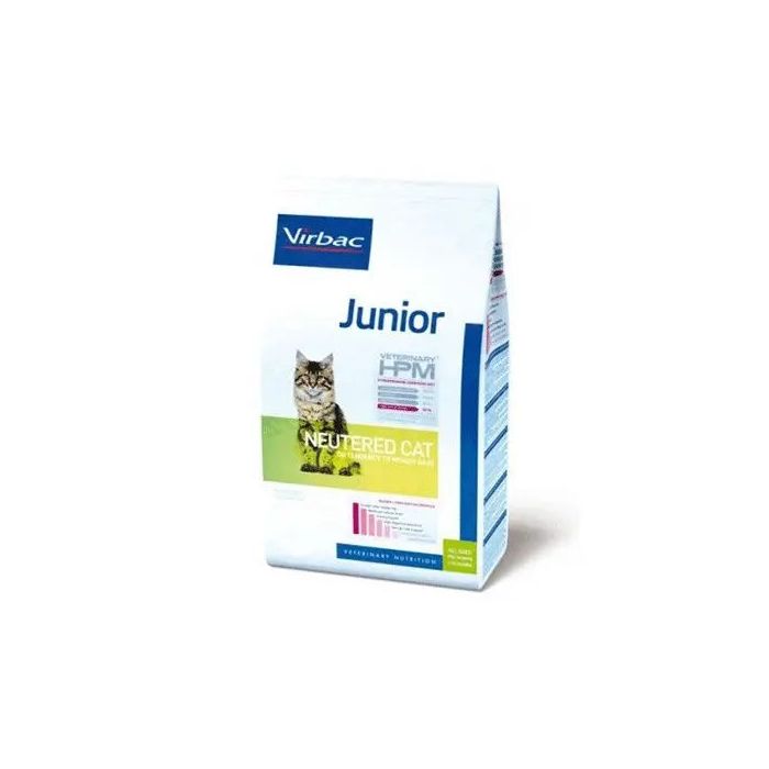 Veterinary HPM Junior Neutered Cat es una dieta completa para gatos jóvenes, desde la esterilización y hasta los 12 meses de edad.VETERINARY HPM™ es una nueva generación de alimentos para gatos diseñada para acercarse al máximo a las necesidades nutricionales de los carnívoros. Se basa en una fórmula baja en hidratos de carbono y rica en proteínas. El resultado es una nutrición que se adapta perfectamente a las necesidades de tu gato.El pienso Junior Neutered Cat de Virbac cuenta con un 44% de proteína, de la cual el 91% es de origen animal.Una vez esterilizados, los gatos jóvenes siguen estando predispuestos al sobrepeso aunque sigan creciendo, HPM Junior Neutered Cat está especialmente formulado para adaptarse a las necesidades del gato en esta periodo de su vida. BeneficiosCrecimiento tras la esterilización. El riesgo de sobrepeso que puede ocurrir tras la esterilización, se limita gracias a una energía moderada, raciones adaptadas y el suplemento de L-carnitina. Además, el contenido elevado de proteínas contribuye al desarrollo muscular.Aporte calórico moderado. Un contenido reducido de grasas y un contenido incrementado de fibras aseguran que la energía de la dieta sea la apropiada para el final del crecimiento después de la esterilización.Salud urinaria. El nivel elevado de proteínas animales estimula la ingestión de agua, incrementa la cantidad de la orina y ayuda a estabilizar el pH para un sistema urinario saludable. El suplemento de quitosán ayuda a regular la eliminación de fósforo en la orina, para mejorar la prevención de la formación de cristales de estruvita.Tolerancia digestiva. El bajo contenido de almidón ayuda a asegurar que el alimento sea bien tolerado por el sistema digestivo del animal. La elección de prebióticos y probióticos regulan el tránsito intestinal y contribuyen a mantener una salud intestinal óptima.Refuerzo para la piel y el pelo. Los niveles elevados de proteínas y el correcto equilibrio de ácidos grasos omega-3 y omega-6 contribuyen al desarrollo de las funciones de la piel y a la formación del pelaje. VETERINARY HPM™Gracias a su perfil nutricional y a la selección precisa de ingredientes funcionales, VETERINARY HPM™ es algo más que un simple alimento para gatos. Contiene una amplia variedad de beneficios para la salud, permitiendo que tu gato disfrute de una mejor protección de su estado fisiológico y conserve una buena salud general.Especificaciones del productoComposición:Proteínas de cerdo y de aves deshidratadas, almidón de patata (mínimo 4%), grasas animales,proteínas de cerdo y de aves hidrolizadas, guisantes,minerales, vainas de haba, proteínas de salmón deshidratadas, arroz (mínimo 4%), lignocelulosa, linaza, pulpa de remolacha, levadura de cerveza (fuente de betaglucanos), fibra de psyllium (Plantago (L.) spp.), fructooligosacáridos,crustáceos hidrolizados (fuente de quitosán),condroitín sulfato, Lactobacillus acidophilus.Veterinary HPM™ no contiene saborizantes ni colorantes artificialesConstituyentes analíticos:(% como alimento): Humedad 5,5%, proteína 44%, ratio proteína animal/vegetal 91/09, materia grasa bruta 16%, minerales 8,5%, celulosa bruta 6%, ELN*: 20%, almidón: 13,5%, calcio: 1,3%, fósforo: 1,1%, ratio Ca/P: 1,2, sodio: 0,7%, ácidos grasos omega-6: 2,8%, ácidos grasos Omega-3: 0,8%EM** calculada (kcal/100g)*** 384 * Extracto libre de nitrógeno. ** Energía metabolizable. *** Calculada con NRC 2006.
