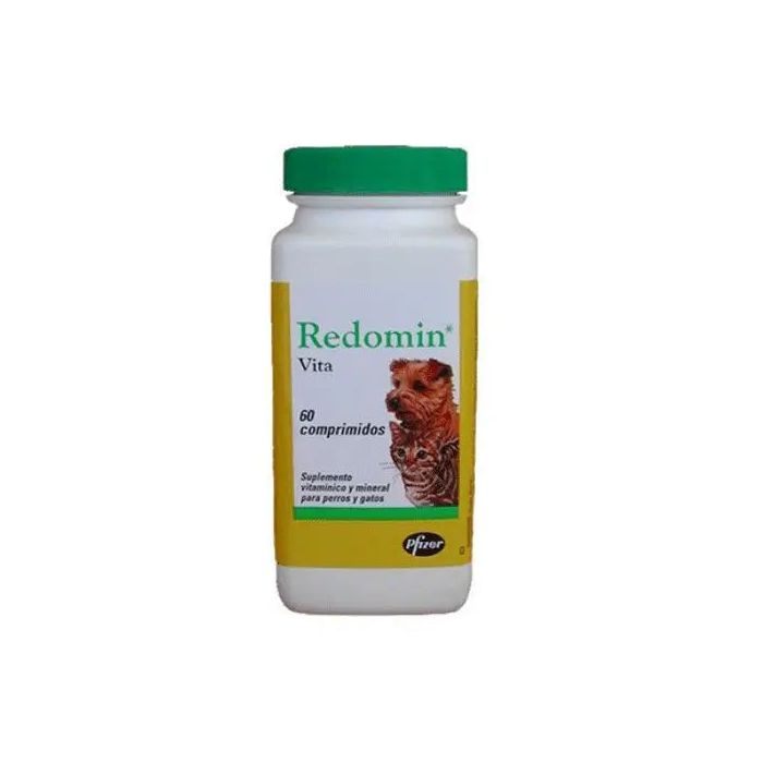 Suplemento multivitaminico para perros y gatos Redomin Vita. Complemento nutricional en pastillas para asegurar un completo aporte de vitaminas y minerales en perros y gatos. Su completa fórmula contiene todas las vitaminas y minerales para el mantenimiento de las funciones vitales y la recuperación de la energía y vitalidad de su mascotas. Estos comprimidos están especialmente diseñados para prevenir los estados carenciales de su perro y gato. Está especialmente indicado para suplementar la alimentación de perros y gatos con necesidades nutricionales aumentadas o carencias nutritivas debido a crecimiento, actividad intensa, enfermedades, tratamiento con antibióticos prolongados, pérdida de apetito o cualquier otro proceso que requiera un aporte extra de nutrientes. Ingredientes: sustancias minerales, subproductos de origen vegetal, subproductos animales, extractos de proteínas vegetales, azúcares, fosfato monocálcico, óxido de magnesio, cloruro sódico. Composición por comprimido: Vitamina A 1000UI, Vitamina D3 24 UI, Vitamina E (alfa-tocoferol) 2 UI, Vitamina B1 (Tiamina monohidratada) 0,8 mg, Niacinamida 10 mg, Vitamina B6 (Piridoxina) 0,1 mg, Vitamina B2 (Riboflavina) 1 mg, Vitamina B12 0,5 mg, Hierro 4,0 mg, Cobre 0,1 mg, Cobalto 13,0 μg, Manganeso 0,25 mg y Zinc 1,5 mg. Modo de empleo: administre directamente en la boca del animal o bien triturados y mezclado con la comida. Los comprimidos son muy bien aceptados por la mayoría de los animales. Posología: Perros pequeños y gatos: 1/2 comprimido diario. Perros medianos: 1 comprimido diario. Perros grandes: 2 comprimidos diarios. No administrar conjuntamente con suplementos de vitamina D. Disponible en envases con 60 comprimidos. El uso de este medicamento debe estar supervisado por un veterinario. Le aconsejamos que consulte cualquier duda con su veterinario habitual o con nosotros a través de la sección "Consultas veterinarias".