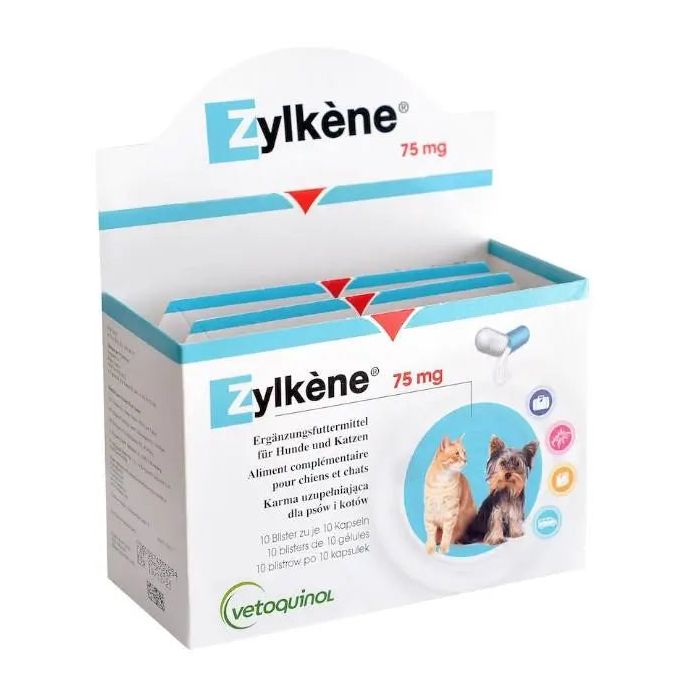 Producto antiestrés para perros y gatos Zylkene Tranquilizante natural para perros y gatos Zylkene es un suplemento nutricional formulado a partir de la leche e indicado para la prevención o el tratamiento de problemas relacionados con el estrés y el comportamiento del animal. Este producto tranquilizante para perros y gatos relaja al animal antes de que se produzca una situación de estrés previsible. Los problemas de comportamiento en los animales derivan en situaciones de estrés y son bastante frecuentes. Algunos tienen causa médica, por esta razón debes consultar con tu veterinario. El tranquilizante Zylkene, elaborado por Vetoquinol Especialidades Veterinarias, ayuda a tu mascota a superar cambios, viajes, ruidos, visitas o desplazamientos. Es natural gracias a la alfa-casozepina, una molécula derivada de proteínas de la leche, con efecto relajante. Sus resultados de ansiolítico moderado o calmante son similares a los que se pueden encontrar en otros fármacos como el diazepam. Zylkene presenta una solución en polvo, soluble al agua y libre de lactosa. Es de fácil administración, pero se debe extremar precaución en casos de animales alérgicos o sensibles a la leche. Es de buen sabor para el animal y no produce efectos secundarios. Se puede emplear en periodos largos de tiempo. VENTAJAS: Producto tranquilizante para perros y gatos. Previene y trata problemas de comportamiento relacionados con el estrés. Tiene efectos calmantes, pero no secundarios. Ayuda a tu mascota a sobrellevar situaciones de cambio. USO Y ESPECIFICACIONES: Producto calmante para gatos y perros indicado en situaciones previsibles de estrés o de comportamiento derivado del estrés. El producto viene dosificado según tamaño del animal, por eso se recomienda que para gatos y perros hasta 10 Kg el formato pequeño y el resto de formatos para perros superiores en peso (especificado en cuadro inferior). Suministra la cápsula en la boca de la mascota o mezcla el polvo junto con la comida habitual. Puede emplearse durante 30 o 60 días con posibilidad de continuación. COMPOSICIÓN: Alfa-S1 75 mg, maltodextrina 170 mg y estearato de magnesio 10 mg. (Zylkene 75 mg). Alfa-S1 225 mg, maltodextrina 225 mg y estearato de magnesio 5 mg. (Zylkene 225 mg). Alfa-S1 450 mg, maltodextrina 450 mg y estearato de magnesio 13,5 mg. (Zylkene 450 mg). DOSIFICACIÓN: La dosis diaria se puede proporcionar de una vez o dividida en dos partes. Debe supervisar un veterinario. PESO CANTIDAD DIARIA Gatos y perros de menos de 5 Kg 1 cápsula 75 mg al día Gatos y perros de 5 a 10 Kg 2 cápsula 75 mg al día Perros de 10 a 20 kg 1 cápsula 225 mg al día Perros de 20 a 40 Kg 1 cápsula 450 mg al día Perros de más de 40 Kg 2 cápsula 450 mg al día Tamaño/formato: Disponible en 3 presentaciones diferentes. Envase pequeño (perros y gatos) 75 mg Envase mediano (sólo perros) 225 mg Envase grande (sólo perros) 450 mg Cada envase contiene 30/100 comprimidos. Tranquilizante natural Zylken hace que tu mascota supere el estrés de forma fácil.